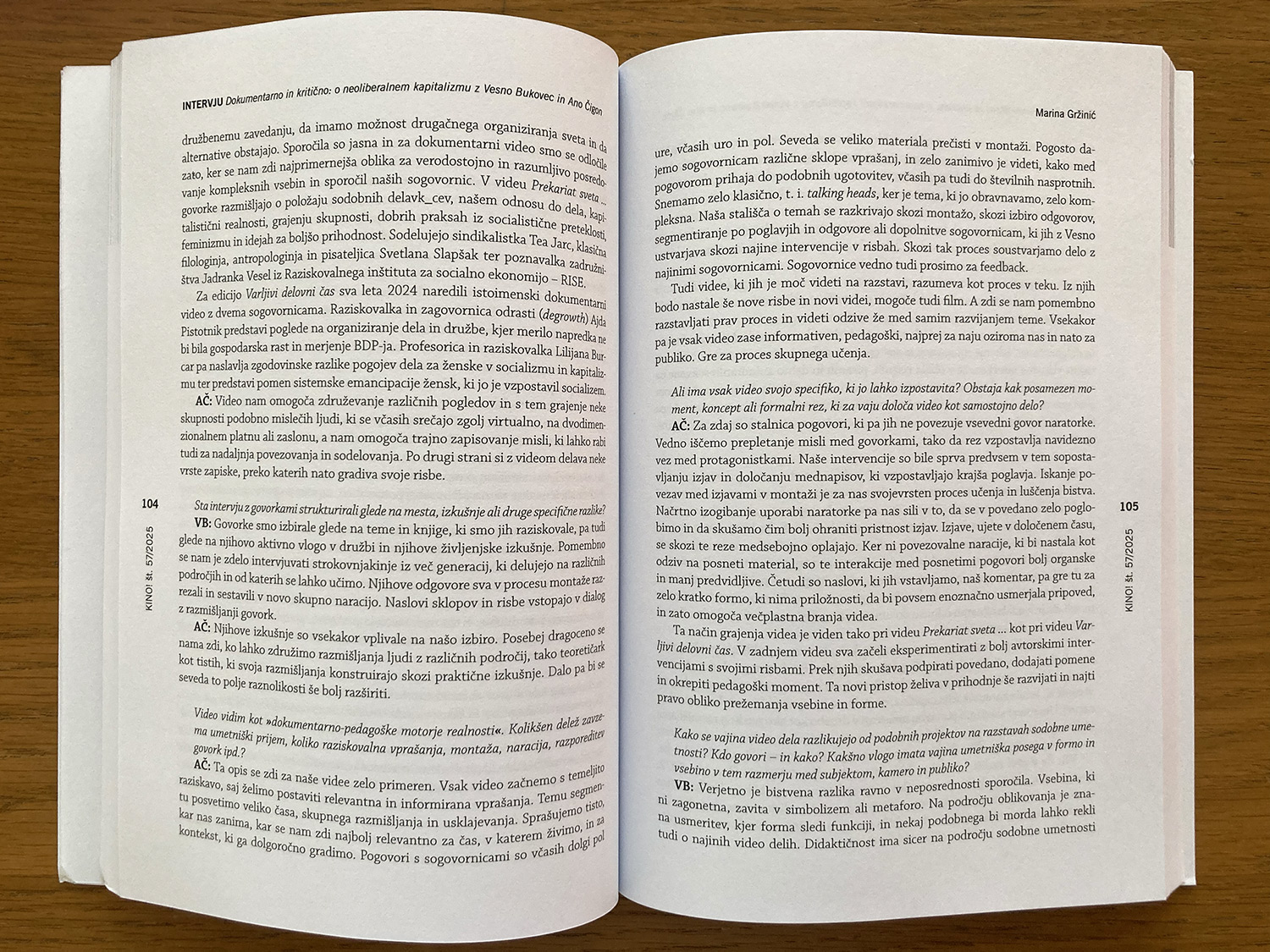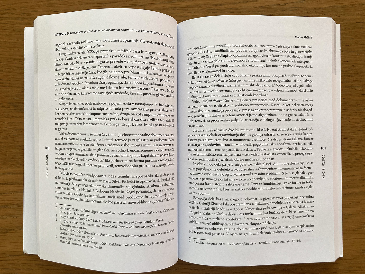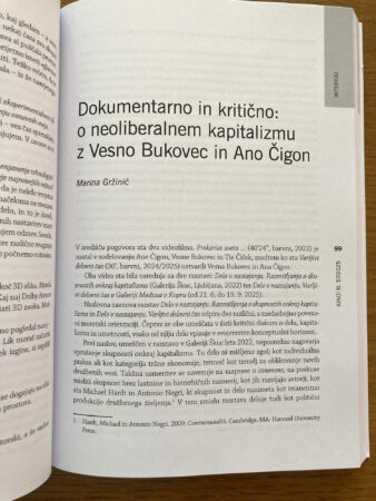 Filozofinja Marina Gržinić je pripravila analizo in se z nama pogovarjala o dveh videih: Prekariat sveta … (Ana Čigon, Vesna Bukovec, Tia Čiček, 2022) in Varljivi delovni čas (Ana Čigon, Vesna Bukovec, 2024/2025). Oba sta bila vključena na razstavo Delo v nastajanju. Varljivi delovni čas v Galeriji Meduza v Kopru poleti 2025.